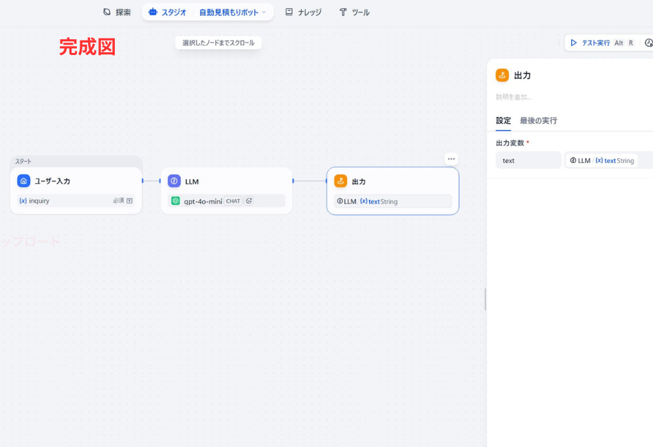- LLMノードの右に「終了(End)」を追加し、出力変数に
