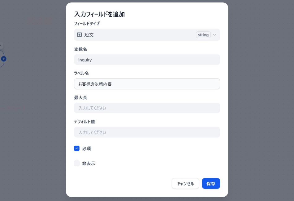 - 「+ 入力フィールド」から「テキスト(String)」を選びます。