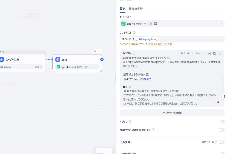 - 開始ノードの右に「LLM」を追加し、お好みのモデル(gpt-4o-miniなど)を選びます。