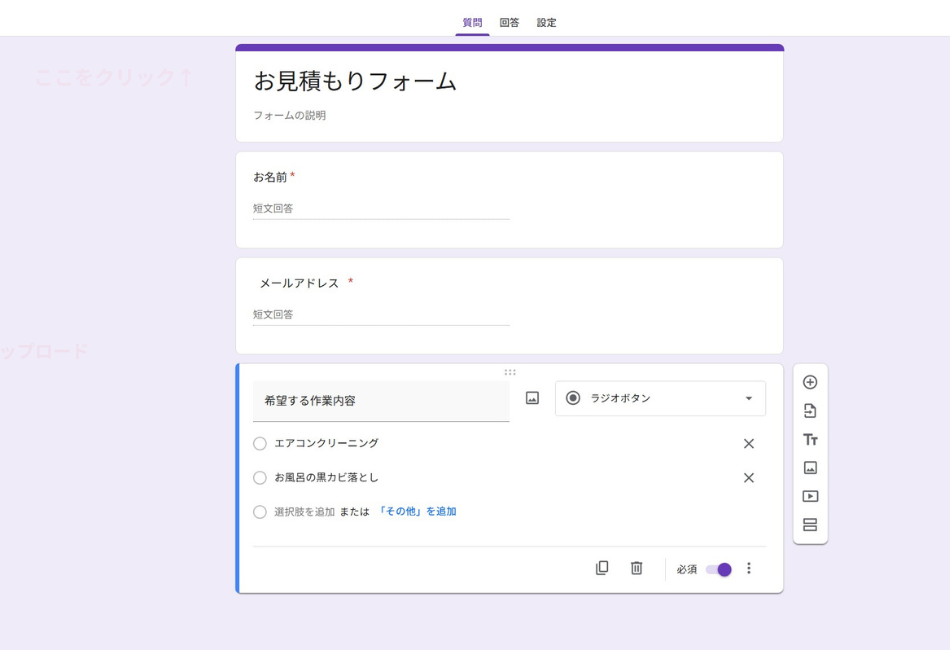 - 新しいGoogleフォームを作成し、以下の3つの質問を作ります。