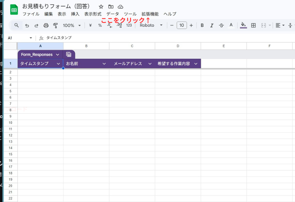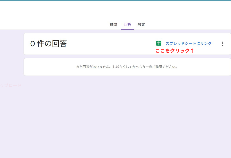 - 画面上部の「回答」タブを開き、緑色の「スプレッドシートにリンク」を押して新しいシートを作成します。