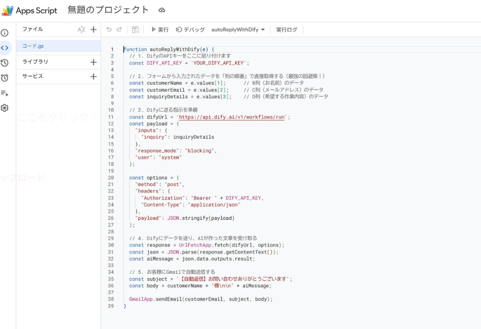 'YOUR_DIFY_API_KEY'の部分を、ステップ1でメモしたご自身のAPIキーに書き換えます。 - 【🚨超重要🚨】 画面上部の**「フロッピーディスクのマーク(プロジェクトを保存)」**を必ずクリックします!(これを忘れると動きません!)