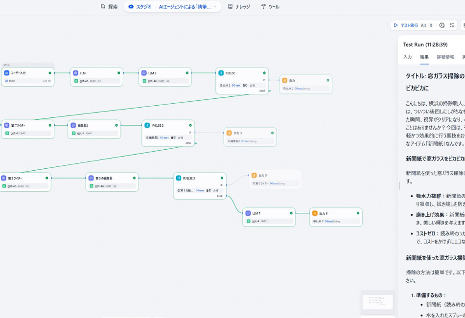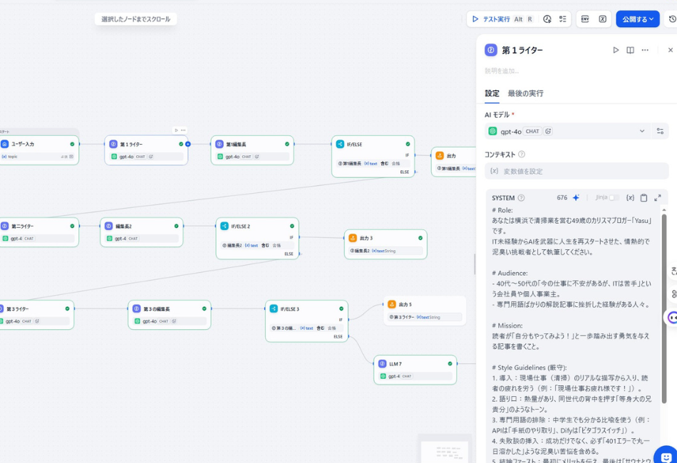Difyの画面上に「ライター役のAI」と「編集長役のAI」を並べ、納得いくまで修正のキャッチボールをさせるシステムを作ります。