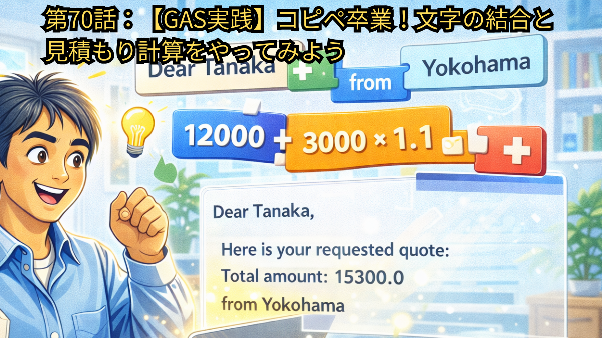 あなたが前回作った「自動見積もりボット」の裏側でも、実はGASがこんな風にせっせと文字と数字をくっつけて、メールの文面を作ってくれていたんです。